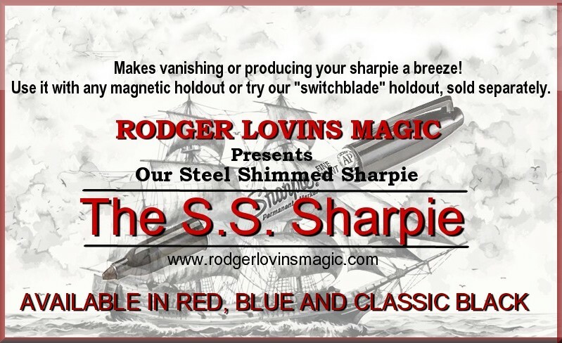 This small holdout device is magnetic and can be placed most anywhere. Outside of your back pocket, under the tail of your jacket, on your belt or anywhere else you may like to switch out, make a steal or drop off a vanish of your knives or any small object that can be held by a magnet! I have used it to produce a small metal wand and our steel shimmed Sharpie!